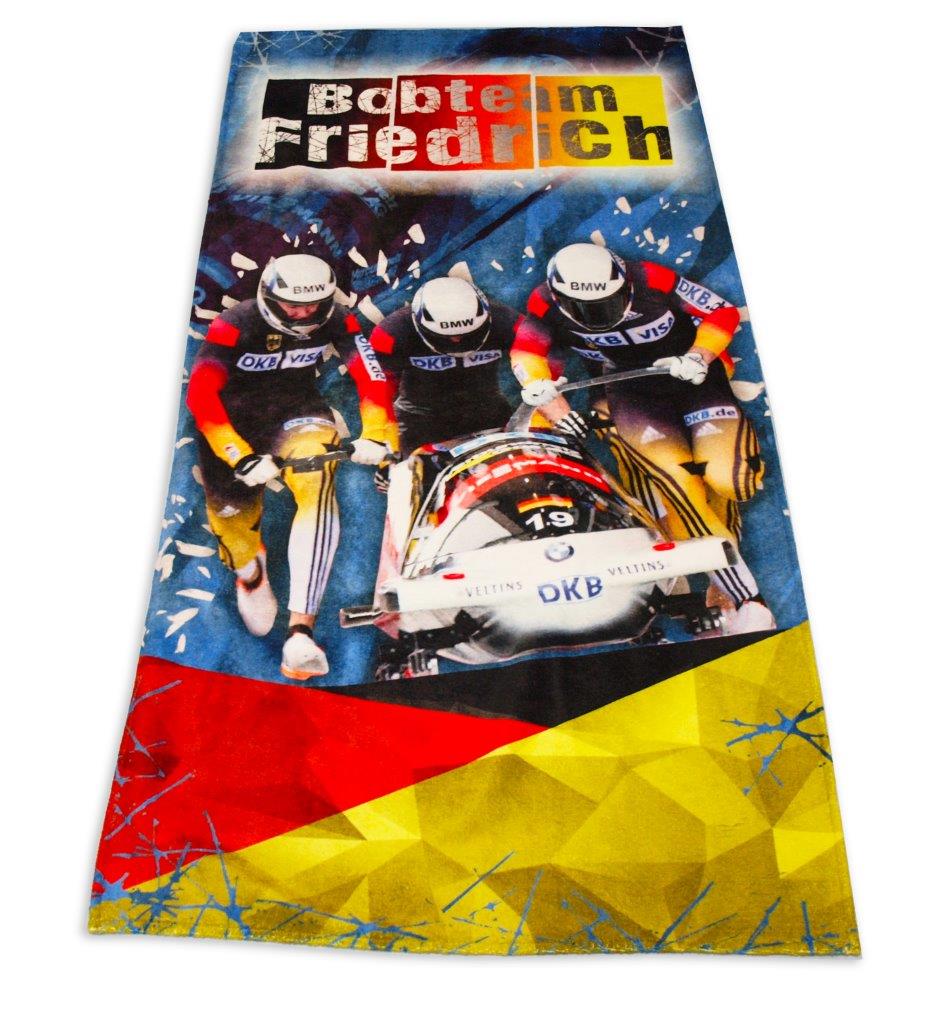 Velour-Frottierartikel - nach Ihren Wünschen bedruckt Art. 0390 Wir entwerfen nach Ihren Vorstellungen ein individuelles Design. Die abgebildeten Frottiertücher sind Referenzen, die wir bereits für unsere Kunden angefertigt haben. Lassen Sie sich gerne davon inspirieren und entwickeln Sie daraus Ihre Ideen, die wir zusammen mit Ihnen umsetzen. Kontaktieren Sie uns per Mail an geschenk-shop@braendl.de und teilen Sie uns Ihre Wünsche mit. Falls vorhanden benötigen wir Ihre Logos als Vektorgrafik, Bilder mit hoher Auflösung und Farbwünsche, gerne auch mit konkreten Farbwerten. Diesen Artikel können wir in vielen Größen anfertigen - vom Waschhandschuh über Hand- und Duschtücher bis hin zum riesigen Strand-Badelaken. Es gibt keine Mindestabnahmemenge. Perfekt als Geschenk für Kunden und Vereinsmitglieder sowie als Merchandise-Artikel für Sportvereine. Die bedruckte Vorderseite besteht aus 100% Microfaser-Polyester - weich und kuschelig, die unbedruckte Rückseite aus 100% Baumwolle Walkfrottier - saugfähig und hautsympathisch.